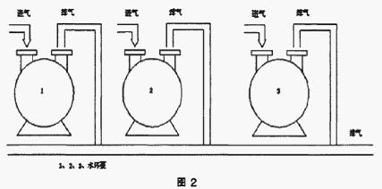第二,多臺水環(huán)泵不采用排氣管道串并聯(lián)使用(如圖2),我公司目前多處使用該連接方式,而是采用單臺泵單用排氣管。